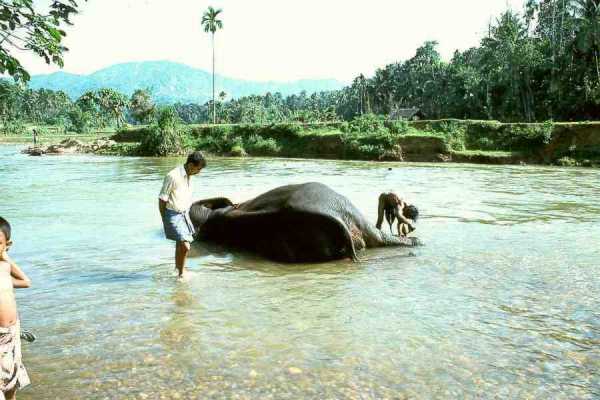 Because of their very inefficient digestive system, an elephant needs to consume about 300 hundred pounds of vegetable matter, grasses, fresh leaves, and fruits, and drink about 30 gallons of water per day. About half the food intake is passed through as undigested matter.