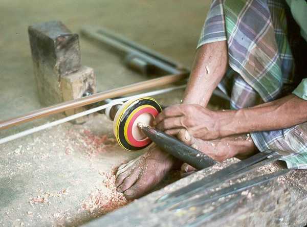 Once ready, lacquers of various colors are applied, in bands as shown here, or in free hand patterns, depending on the ability of the craftsman. Once the lacquer is applied, it is heated and polished, using a part of a tempered palm leaf, to a high gloss. During this process different colors of hot lacquer blend into each other creating interesting patterns, so that no two finished products look alike. In the old days the lacquers were home made by each craftsman, using his own secret recipe. But in modern times they are more often bought at the local crafts shop.